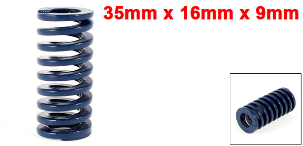 Product Name Compression Spring Material Metal Outside Diameter 16mm / 0.6" Inner Diameter 9mm / 0.4" Total Length 35mm /1.4" Color Blue Weight 17g Package Content 1 x Compression Spring - Reviews