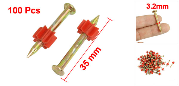 Product Name Power Hammer Pin Color Gold Tone, Red Material Metal, Plastic Tip Diameter 1.3mm/0.05" Shank Diameter 3.2mm/0.13" Overall Size 35 x 9.3mm/1.4" x 0.4" (L*Max. D) Weight 273g Package Content 100(±5%) x Power Hammer Pins - Reviews