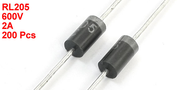 Product Name Rectifier Diode Model RL205 Forward Current 2A Max Peak Reverse Voltage 600V Lead Size 0.7 x 25mm/ 0.01" x 1"(D*L) Body Size 3.5 x 6.5mm/ 0.13" x 0.25" (D*L) Main Color Black, Silver Tone Weight 67g Package Content 200 Pcs(±2%) x Rectifier Diodes - Reviews