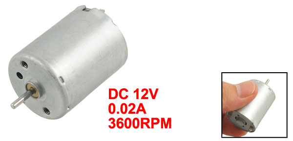 Product Name DC Micro Motor Model NO. RF370CH-12560-42DV Rated Voltage DC 12V Current(no load) 0.02A Speed(no load) 3600RPM Rated Torque 20.1g.cm Body Size 24 x 30mm / 0.94" x 1.1" (D*H) Shaft Dia. 2mm/ 0.078" Total Length 20mm / 2" Main Color Silver Tone Material Metal Weight 51g Package 1 x DC Micro Motor - Reviews