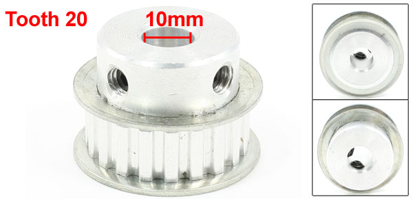 Product Name Timing Pulley Type XL20 Number of Tooth 20 Pitch 1.6mm/1/16'' Top Diameter 27mm/1.06" Overall Size 36 x 25mm/1.4'' x1''(D*H) Bore Diameter 10mm/25/64" Fit Belt Width 11mm/0.43'' Material Aluminum Color Silver Tone Weight 49g Package Content 1 x Timing Pulley - Reviews