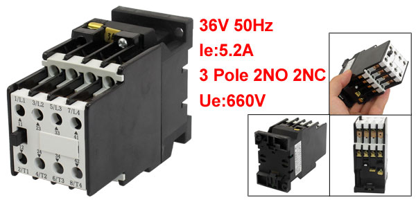 36V 50Hz Coil 5.2A Three Poles 2NO 2NC 35mm Mounting Rail 4KW AC Contactor