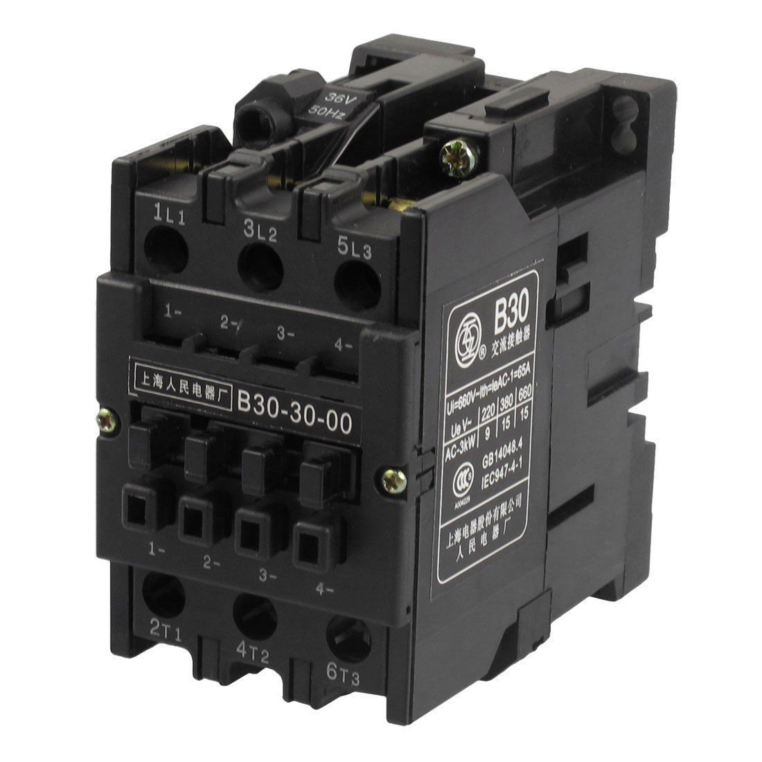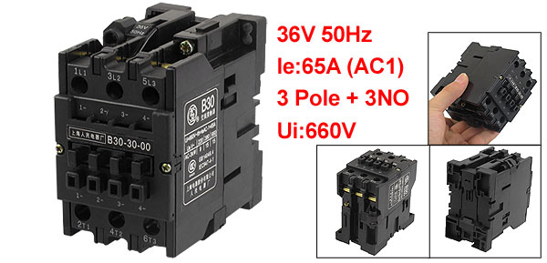 Product Name AC Contactor Model Number B30-30-00 Material Plastic, Metal, Electrical Parts Coil Voltage 36V 50Hz Ui 660V Ue 660V Ith 65A Ie 65A (AC-1) Power 15KW(AC-3) Number of Contact 3 Pole + 3NO Terminals Number 4 Screw Terminals Altitude <2000m Temperature -5C~40C Relative Humidity 50%(40C) Overall Size (Approx.) 9.5 x 8.7 x 5.4cm/3.74" x 3.43" x 2.13"(L*W*T) Mounting Size 35mm Mounting Rail Color Black Net Weight 495g Package Content 1 x AC Contactor - Reviews