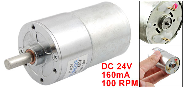 Product Name Gear Motor Rated Voltage DC 24V Rated Current 160mA Rated Torque 2.04Kg.cm Rated Speed 100 RPM Shaft Size 15 x 6mm/0.6" x 0.24" (L*D) Motor Body Length 58mm/2.3" Motor Body Diameter 37mm/1.46" Thread Diameter 2.5mm/0.1" Total Length(Included Pin) 85mm/3.35" Material Metal, Electronic Parts Color Silver Tone Weight 194g Package Content 1 x Gear Motor - Reviews