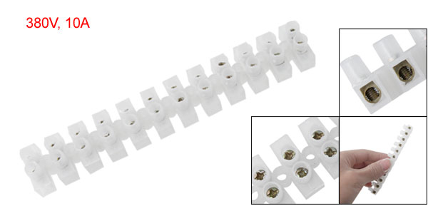 Product Name Terminal Block Material(external) Plastic Color White, Gold Tone Type 12 Postions, 2 Rows Rated Value 380V, 10A Cable Entry Diameter 0.3cm/0.12'' Size 11.2x 1.7x 1.5cm/4.4'' x 0.7'' x 0.6'' (L*W*H) Weight 19g Package Content 1 x Terminal Block - Reviews