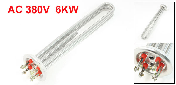 Product Name Water Heater Element Shape 3U Tube Bundle Type Main Material Stainless Steel Rated Voltage AC 380V Power 6KW Terminal Number 6 Bar Diameter 8mm / 0.315" Silicone Ring Dia. 60mm/ 2.4" Overall Size(Approx.) 30 x 6.5cm/ 11.5" x 2.5"(L*Max.D) Thread Diameter 4mm / 0.15" Color Silver Tone Weight 434g Package Content 1 x Water Heater Element