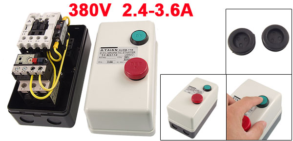 Product Name Magnetic Starter Model HUEB-11K Type Non-reversing Type, Momentary Push Button Coil Voltage 380V, 50/60Hz AC Contactor Ui: AC 660V Ith: 10A Contact: 4NO + 1NO, 3 Phase AC3 220 230 380 660 3KW/ 4HP 3KW/ 4HP 5.5KW/ 7.37HP 5.5KW/ 7.37HP 12A 12A 12A 7A Relay Setting Range: 2.4-3.6A Contact: 1NO+1NC Size 161 x 85 x 108mm/ 6.3" x 3.3" x 4.3" (L*W*H) Push Button Diameter 19mm/ 0.75"; 28mm/ 1.1" External Material Plastic Color As Picture Shown Net Weight 648g Package Content 1 x Magnetic Starter - Reviews