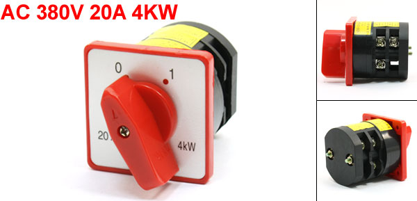 Product Name Cam Switch Model No. HZ5-20/4 L02 Rating 380V 20A 4KW Positions 2 Positions(0-1) Terminal 6 Terminals Body Size 56 x 48 x 54mm / 2.2" x 1.9"x 2.1"(L*W*T) Panel Size 60 x 60 mm/2.4" x 2.4" (L*W) Overall Height 85mm / 3.3" Mount Hole Diameter 4mm/0.16" Mount Hole Center Distance 46mm/1.8" External Material Plastic, Electronic Parts Color Red, Black Net Weight 183g Package Content 1 x Cam Switch