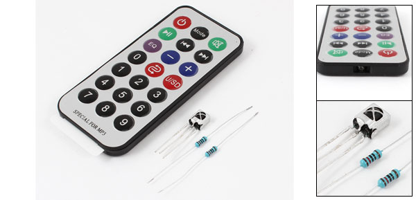 Product Name Remote Control Kit Controller Powered By 2 x 1.5V AG10 Battery(Not Included Here) Button Quantity 21 Frequency 38KHZ Transmitting Diatance 8M / 26Ft (open space) Controller Body Size 8.5 x 4 x 0.6cm/3.3" x 1.6" x 0.24"(L*W*T) Resistance for Each Resistor 220 Ohm Materials Plastic, Metal, Electronic Parts Net Weight 20g Package Content 1 x Remote Controller