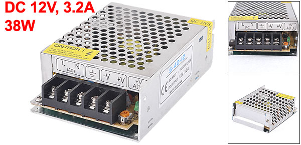Details38W 12VDC 3.2A Switching Power Supply Driver for LED Strip light 110V/220V  Product Name Switching Power Supply Model No. S-38-12 Input 110/220V±15% Output DC 12V, 3.2A DC Output Power 38W Terminal Quantity 5 Total Size 10.9 x 7.8 x 3.5cm/ 4.3" x 3.1" x 1.4" (L*W*T) Case Material Metal Main Color Silver Tone Net Weight 208g Package Content 1 x Switching Power Supply