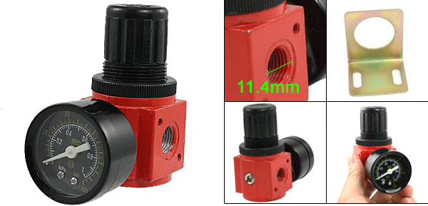 Product Name Air Source Treatment Regulator Model 395-8 Material Metal, Plastic Working Medium Air Max. Pressure 1.6Mpa Adjustable Pressure Range 0.05-1Mpa Bore Diameter 3mm/ 0.118" Thread Diameter 11.4mm/ 0.448" Pressure Gauge Connector Dia 9mm/ 0.354" Pressure Gauge Range 0-1MPa Total Size 8 x 4 x 4cm / 3.1" x 1.6" x 1.6"(L*W*H) Pressure Gauge Size 4.8 x 2.4cm/ 1.8" x 0.9"(D*T) Color Black, Red Weight 207g Package Content 1 x Pneumatic Regulator
