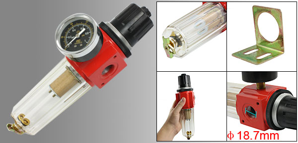 Product Name Air Filter Regulator Material Metal, Plastic Operating Fluid Air Adjustable Pressure Range 0.05-1MPa Working Temperature 0-50°C Thread Diameter 18.7mm/ 0.736" Bore Diameter 4mm/ 0.157" Pressure Gauge Connector Dia 11mm/ 0.433" Total Size 24 x 5.6 x 5.6cm / 9.4" x 2.2" x 2.2" (L*W*T) Pressure Gauge Size 5.3 x 2.6cm/ 2.1" x 1"(D*T) Color Red, Black, Clear Weight 705g Package Content 1 x Pneumatic Filter Regulator 1 x Pressure Gauge 1 x Install Stand - Reviews