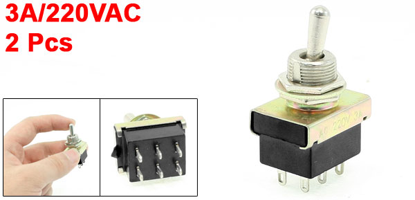 Details3A/220VAC ON/ON DPDT 2 Position 6-Terminals Toggle Switch 2 Pcs  Product Name Toggle Switch Type DPDT (ON/ON) Position 2 Mounting Hole Diamter 12mm / 0.47" Voltage & Current 3A 220VAC Main Body Size 25 x 18 x 22mm / 1" x 0.7" x 0.9"(L*W*H) Overall Height 45mm / 1.8" Material Metal & Resin Color As Picture Shown Weight 32g Package Content 2 Pcs x Toggle Switch