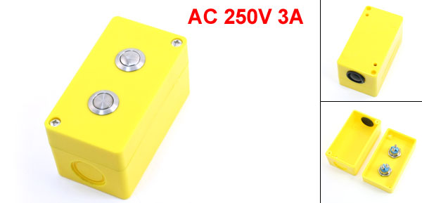 Product Name Push Button Station Action Type Momentary Action Contact Type SPST Working Voltage & Current 3A 250VAC Max. Withstand Current 16A Button Dia 1.8cm/0.7" Overall Size 9 x 5 x 5cm/3.5" x 2" x 2"(L*W*H) Wire Hole Dia 20mm/0.78" Mounting Hole Dia 4mm/0.16" Mount Hole Distance 60mm x 35mm/2.4" x 1.4"(L*W) Material Plastic, Metal Color Yellow, Silver Tone Net Weight 83g Package Content 1 x Push Button Station - Reviews
