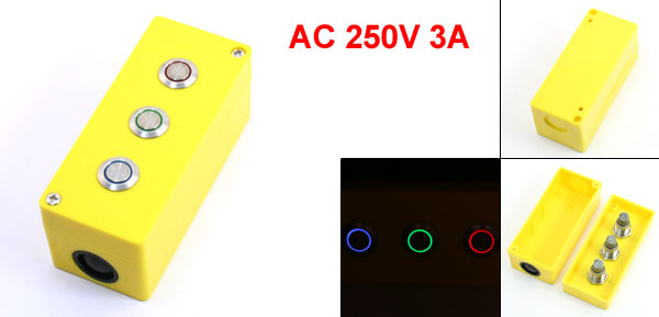 Product Name Push Button Station Action Type Locking Red Green Blue Round Flat Button Contact Type SPDT 1NO 1NC Working Voltage & Current 3A 250VAC Max. Withstand Current 16A Light Voltage 12V Light Color Red, Green, Blue Button Dia 1.8cm / 0.7" Overall Size 11.5 x 5 x 5cm / 4.1" x 2" x 2"(L*W*H) Wire Hole Dia 20mm/0.78" Mounting Hole Dia 4mm/0.16" Mount Hole Distance 86mm x 35mm / 3.4" x 1.4"(L*W) Material Plastic, Metal Color Green, Red, Yellow, Silver Tone Net Weight 106g Package Content 1 x Push Button Station - Reviews