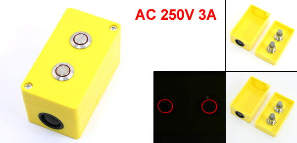 Product Name Push Button Station Action Type Momentary and Latching Round Flat Button Contact Type SPDT 1NC 1NO Working Voltage & Current 3A 250VAC Max. Withstand Current 16A Light Voltage 12V Light Color Red Button Dia 1.8cm/0.7" Overall Size 9 x 5 x 5cm/3.5" x 2" x 2"(L*W*H) Wire Hole Dia 20mm/0.78" Mounting Hole Dia 4mm/0.16" Mount Hole Distance 60mm x 35mm/2.4" x 1.4"(L*W) Material Plastic, Metal Color Red, Yellow, Silver Tone Net Weight 72g Package Content 1 x Push Button Station - Reviews