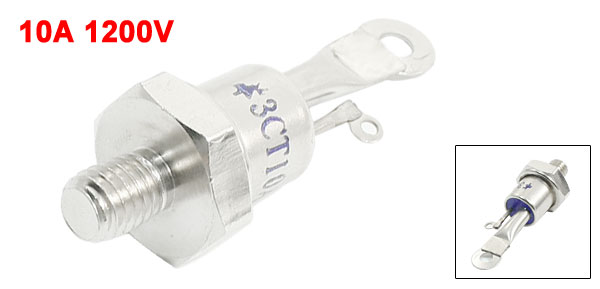 Product Name Phase Control Thyristor Model 3CT10A / KP10A Average Forward Current 10A Repetitive Peak Reverse Voltage 1200V Thread Dia(Approx) 7mm / 0.28" Overall Size(Approx) 56 x 18mm /2.2" x 0.71"(L*W) Hole Dia 4.2mm/0.16", 2mm/0.08" Material Metal Color Silver Tone Weight 18g Package Content 1 x Phase Control Thyristor - Reviews