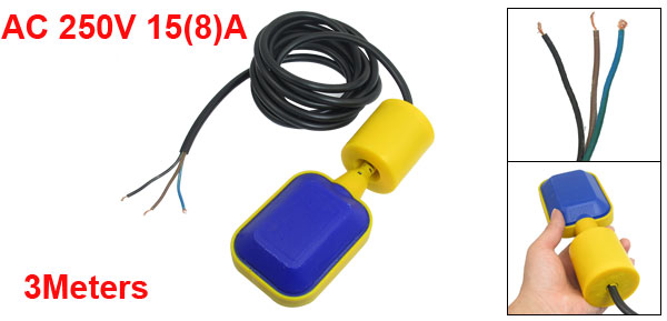 Product Name Float Switch Use for Water Service, Water Draining Color Yellow, Black, Blue Material PVC. Electric Parts Rated Voltage AC 250V Rated Current 15 (8) A Work Temprature 0~80 celsius Cable length 3Meters/ 9.8Ft Floater Size 10.1 x 7.7 x 4.3cm/ 4" x 3" x 1.7" (L*W*T)