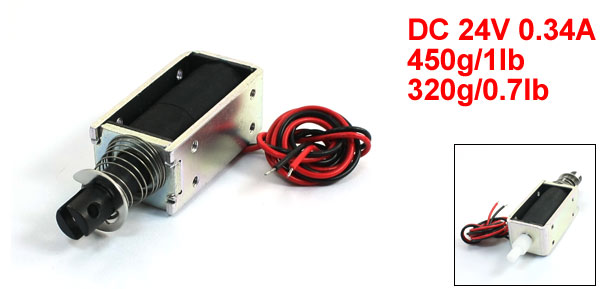 Product Name DC Solenoid Electromagnet Rated Voltage & Current DC 24V 0.34A Power 8.2W Action Form Push Pull Type Force Stroke: 3mm 450g/1lb
