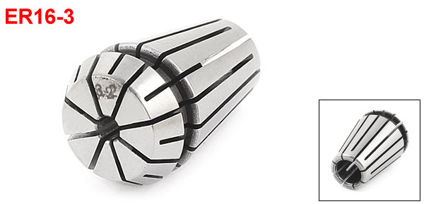 Details3mm ER16 Spring Collet Chuck CNC Milling Lathe Tool Bit Holder ER16-3  Product Name Spring Collet Model No. ER16-3 Gripping Diameter 3mm Overall Size 17 x 27.5mm / 0.67" x 1.1" (Max.D*H) Material Spring Steel Color Silver Tone Net Weight 20g Package Content 1 x Spring Collet