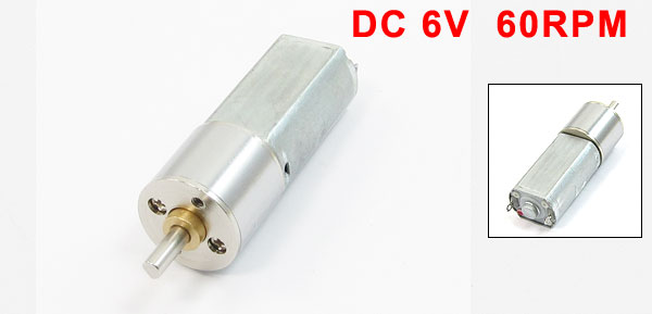 Product Name DC Geared Motor Rated Voltage DC 6V Speed 60 RPM Shaft Diameter 3mm/ 0.12" Gearbox Part Diameter 16mm/ 0.63" Overall Size 16 x 54mm/ 0.63" x 2.1" (D*H) Main Color Silver Tone Material Metal Weight 29g Package 1 x DC Geared Motor - Reviews