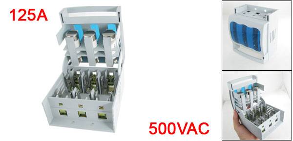 Product Name Fuse Isolating Switch Model No. HR17B-100/30 Fuse Type 22 x 58mm / 0.87" x 2.28"(D*H) Rated Voltage 500VAC Rated Current 125A Rated Limiting Short Current 50kA Rated Heating Current 100A Poles Quantity 3 Fixing Holes Diameter 5.9mm / 0.23", 6.4mm / 0.25" Fixing Hole Spacing 62mm / 2.4" 31 x 103mm / 1.2" x 4"(L*W) Overall Size 119 x 104 x 75.6mm / 4.7" x 4.1" x 3"(L*W*H) External Material Plastic Net Weight 550g Package Content 1 x Fuse Isolating Switch - Reviews