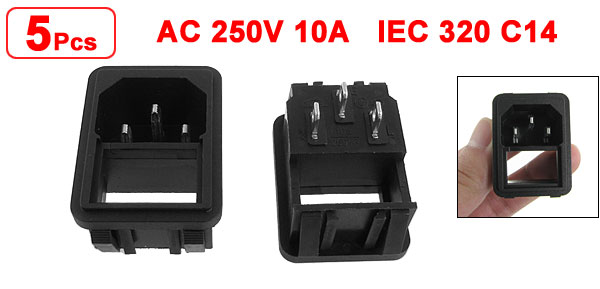Product Name Power Inlet Socket Power Supply AC 250V 10A Plug Type IEC 320 C14 Pins Number 3 Mounting Type Clamp Type Mounting Size 3.8 x 2.7 x 2.4cm / 1.5" x 1.06" x 0.9" (L*W*T) Overall Size 4.1 x 3.1 x 2.9cm / 1.6" x 1.2" x 1.1" (L*W*T) Fit Switch Size 2 x 1.3cm / 0.79" x 0.51" (L*W) Material Plastic, Metal Color Black, Silver Tone Net Weight 64g Package Content 5 x Power Inlet Sockets - Reviews