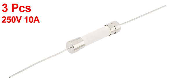 Product Name Ceramic Fuse Rated Power 250V, 10A Body Size 30 x 6mm/ 1.2" x 0.24" (L*D) Wire Leads Length(Each) 39mm/ 1.5" Total Size 112 x 6mm/4.4" x 0.24"(L*D) Function Fast Blow Color White, Silver Tone Material Ceramic, Alloy Weight 12g Package 3 Pcs x Ceramic Fuse - Reviews