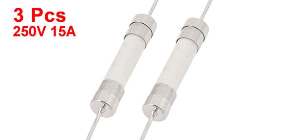 Product Name Ceramic Fuse Rated Power 250V, 15A Body Size 30 x 6mm/ 1.2" x 0.24" (L*D) Wire Leads Length(Each) 30mm/ 1.2" Total Size 90 x 6mm/3.5" x 0.24"(L*D) Function Fast Blow Color White, Silver Tone Material Ceramic, Alloy Weight 10g Package 3 Pcs x Ceramic Fuse - Reviews