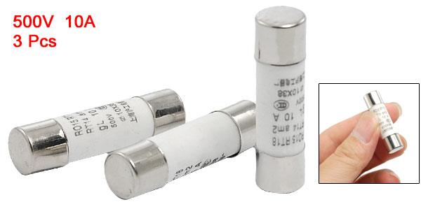 Product Name Cylinder Caps Fuse Type RO15 RT18 RT14 gL Material Metal, Cermic, Electronic Parts Rated Voltage 500V Rated Current 10A Main Color White, Silver Tone Size 10 x 38mm/ 0.39" x 1.49" (D*L) Weight 20g Package Content 3 x Cylinder Caps Fuse - Reviews