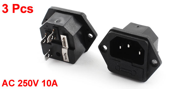 Details3pcs AC 250V 10A 3 Terminal IEC320 C14 Male Power Sockets w Fuse Holder  Product Name Male Power Socket Rated Power AC 250V 10A Inlet Plug Type IEC320 C14 Terminals Number 3 Total Size (Not Inclulding Pins) 4.5 x 3.2 x 2cm/1.8" x 1.3" x 0.8" (L*W*T) Fit for Fuse Size 25 x 5mm/1" x 0.2" (L*D) Mouting Size 3.1 x 2.7 x 1.6cm/1.2" x 1.1" x 0.6"(L*W*T) Mounting Hole Dia 3mm/0.12" Material Plastic, Electronic Parts Main Color Black Weight 37g Package Content 3 x Male Power Sockets