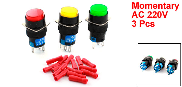 3Pcs AC220V Green Yellow Red Lamp SPDT Momentary Pushbutton Switch w Connectors