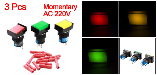 DC 30V 5ALight Voltage AC 220V Light Color Red, Green, Yellow Thread Dia 16mm/0.63" Total Size(Not Included Pin) 31 x 24 x 17mm /1.2" x 0.9" x 0.67" (L *W *H) External Color Red, Green, Yellow, Black Material Plastic, Metal Net Weight 33g Package Content 3 x Rectangle Head Push Button Switch