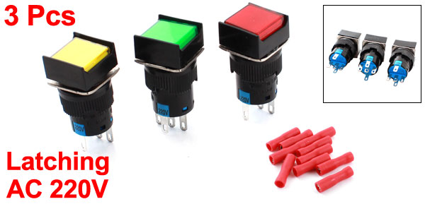 3Pcs AC220V Lamp SPDT Self Locking Square Pushbutton Switch 16mm w Connectors