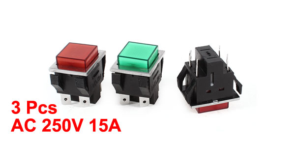 3PCS DPST 4P Momentary Green Red Square Pushbutton Switch AC 250V 15A