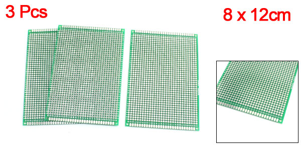 Details3Pcs Electronic Double Sided Glass Fiber Prototype PCB Board 8cm x 12cm  Product Name Double-Sided PCB Board Hole Dia.(Each) 1mm Hole Pitch 2.54mm Total Size 8 x 12cm/ 3.1" x 4.7"(W*L) Mounting Hole Dia. 2mm/0.08" Thickness 1.6mm Materials PCB, Tin Plated, Glass Fiber Main Color Green, Silver Tone Weight 75g Package Content 3Pcs x Double-Sided PCB Board