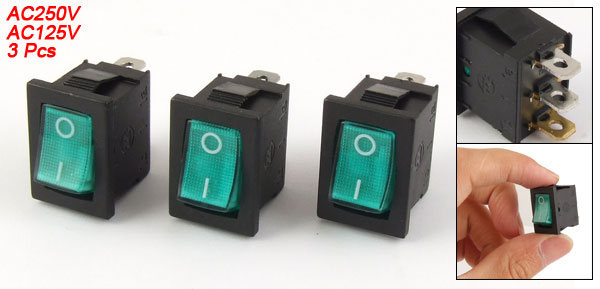 3pcs Green Light ON/OFF I/O SPST Snap In Rocker Switch 3Pin 6A/250V 10A/125V AC