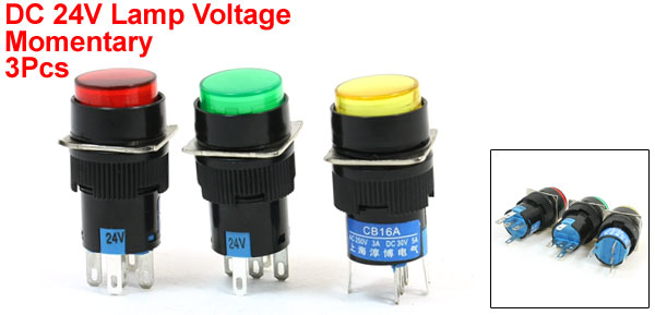 Item Name Push Button Switch Contact Type 1NO, 1NC Action Type Momentary Type Switch Working Voltage AC 250V, 3A Lamp Voltage DC 24V Pin Number 5 Lamp Color Red, Green, Yellow Switch Color Red, Green, Yellow, Black Button Cap Dia 15mm/ 0.59" Mounting Thread Dia. 16mm/ 0.63" Total Size 18 x 18 x 41mm/ 0.71" x 0.71" x 1.6"(L*W*H) Material Plastic, Electronic Parts Weight 25g Package Content 3 x Push Button Switch - Reviews