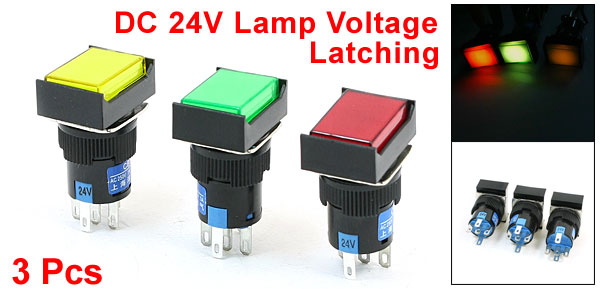 Item Name Push Button Switch Contact Type 1NO, 1NC Action Type Latching Type Switch Working Voltage AC 250V, 3A Lamp Voltage DC 24V Pin Number 5 Lamp Color Red, Green, Yellow Switch Color Red, Green, Yellow, Black Button Cap Size 20 x 15mm/ 0.78" x 0.59"(L*W) Mounting Thread Dia. 16mm/ 0.63" Total Size 23 x 18 x 41mm/ 0.71" x 0.71" x 1.6"(L*W*H) Material Plastic, Electronic Parts Weight 25g Package Content 3 x Push Button Switch - Reviews