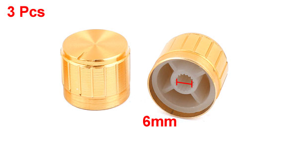 Product Name Potentiometer Control Knob Fit Insert Shaft Dia 6mm Knurled Shaft Total Size 21 x 17mm/0.83" x 0.67"(D*H) Material Plastic Color Gold Tone Weight 12g Package Included 3 x Potentiometer Control Knobs - Reviews