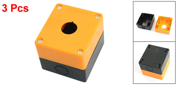 Details3pcs Single Hole 22mm Dia Plastic Push Button Switch Box Orange Black  Product Name Push Button Switch Box Color Orange, Black Hole Diameter 22mm/ 0.87" Overall Size 78 x 72 x 65mm/ 3.1" x 2.8" x 2.6" (L*W*T) Mounting Hole Dia. 5mm/ 0.2" External Material Plastic Weight 116g Package Content 3 x Push Button Switch Boxes Several Fitting Screws