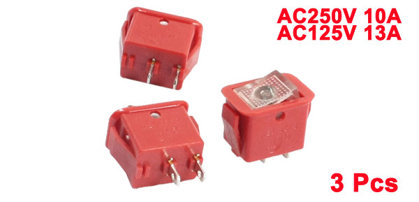Product Name Rocker Switch Model MJ-11 Poles SPST Action Type Latching Terminals 2 Pin (On-Off) Rating Voltage AC250V 10A, AC125V, 13A Total Size(Each One) 19 x 12 x 21mm/ 0.75" x 0.47" x 0.83"(L*W*T) Mounting Size 17 x 11mm/ 0.67" x 0.43"(L*W) Color Red Material Plastic, Metal Weight 9g Package Content 3 x Rocker Switches - Reviews