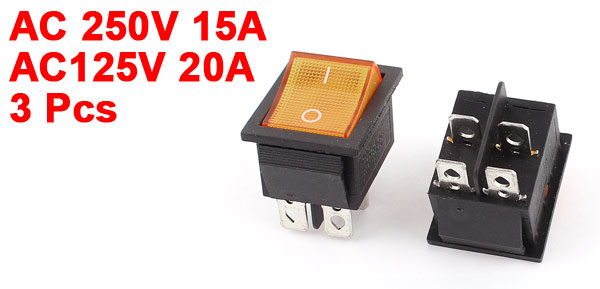 3pcs Yellow Rocker Switch ON/OFF DPST AC 250V 15A AC125V 20A Panel Mount Snap-In