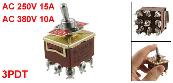 Details3PDT On/Off/On 3 Postion 9 Screw Terminals Toggle Switch AC 250V 15A  Product Name Toggle Switch Type 3PDT (On/ Off/ On) Position 3 Voltage, Current AC 250V 15A AC 380V 10A Mounting Hole Diamter 12mm / 0.456" Main Body Size 32 x 27 x 18mm/ 1.3" x 1.06" x 0.7" (L*W*H) Overall Height 57mm / 2.2" Material Metal, Resin Weight 45g Package Content 1 x Toggle Switch