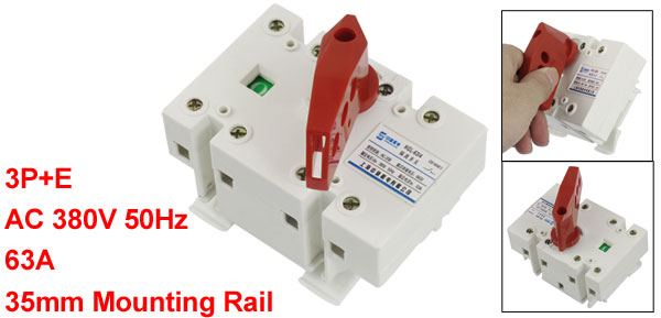 Product Name Isolating Switch Model No. HGL-63/4 Use Category AC-20B Poles Quantity 3P+E Rated Voltage AC 380V 50Hz Rated Current 63A Rated Insulator Voltage 660V Installing Size Standard 35mm Mounting Rail Screw Size 12.3 x 3.8mm/0.48" x 0.15"(L*Dia) Total Size 105 x 70 x 49mm / 4.13" x 2.76" x 1.93"(L*W*H) Key Size 7.3 x 4 x 2.5cm/2.87" x 1.57" x 0.98"(L*W*T) Material Plastic, Metal Main Color White Net Weight 342g Package Content 1 x Isolating Switch