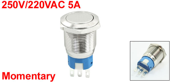 Item Name Push Button Switch Action Type Momentary Type Head Shape Flat Head Contact 1NO 1NC Switch Rating 250V/220VAC 5A Pin Number 3 Thread Diameter 19mm/ 0.75" Total Size(Pin No Include) 31 x 22mm/1.2" x 0.87" (L*Max.W) Material Stainless Steel, Plastic, Electric Parts Housing Color Silver Tone, Blue Weight 18g Package Content 1 x Push Button Switch - Reviews