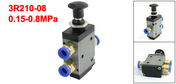 Product Name Air Push-Pull Valve Model 3R210-08 Action Type Latching Black Button Working Medium Clear Air (40µm filteration) Way Type 3 Position Type 2 Fit for Hose Dia 8mm/0.31" Fix Hole Diameter 14mm/ 0.55" Operating Temperature Range 0~ 70°C Working Pressure Range 0.15-0.8MPa Knob Diameter 23mm/ 0.9" Total Size(Approx) 35 x 21 x 85mm / 1.4" x 0.8" x 3.3" (L*W*H) Material Alloy Main Color Gray, Black Net Weight 100g Package Content 1 x Air Push-Pull Valve - Reviews