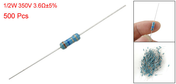 Product Name Carbon Film Resistors Quantity 500 ±2%Pcs Rating Power 1/2W Resistance 3.6ohm Resistance Tolerance ± 5% Working Voltage 350V Mounting Type DIP(Through Hole) Size(Not Include Leads) 2.6 x 8.5mm/ 0.1" x 0.334"(D*L)