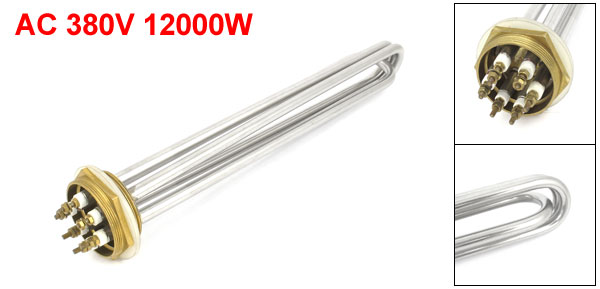 Product Name Water Heater Element Shape 3U Tube Bundle Type Main Material Stainless Steel Rated Voltage AC 380V Power 12000W Bar Diameter 10mm/ 0.39" Overall Size(Approx.) 40 x 5.1cm/ 15.7" x 2"(L*Max.D) Silicone Ring Dia. 72mm/ 2.8" Scew Diameter 3.5mm/ 0.14" Mount Thread Diameter 58mm/ 2" Color Silver Tone Weight 992g Package Content 1 x Water Heater Element