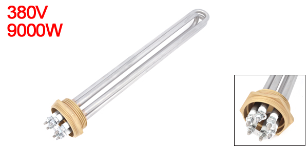 Product Name Water Heater Element Shape 3U Tube Bundle Type Main Material Stainless Steel Rated Voltage 380V Power 9000W Terminal Number 6 Bar Diameter 8mm / 0.3" Overall Size(Approx.) 35 x 3.7cm/ 13.8" x 1.5"(L*Max.D) Screw Diameter 3.6mm / 0.14" Thread Diameter 47mm/ 1.5" Color Silver Tone, Gold Tone Weight 600g Package Content 1 x Water Heater Element